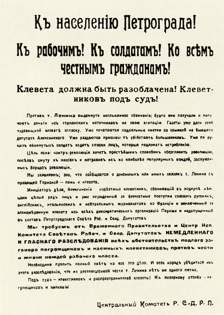 Тем не менее делу дали ход, не дожидаясь результатов начатого расследования. По инициативе министра юстиции Переверзева еще днем 4 (17) июля, когда власть Временного правительства находилась под угрозой, в столичные газеты было отослано изготовленное с помощью сотрудников контрразведки сообщение о том, что Ленин – германский шпион.