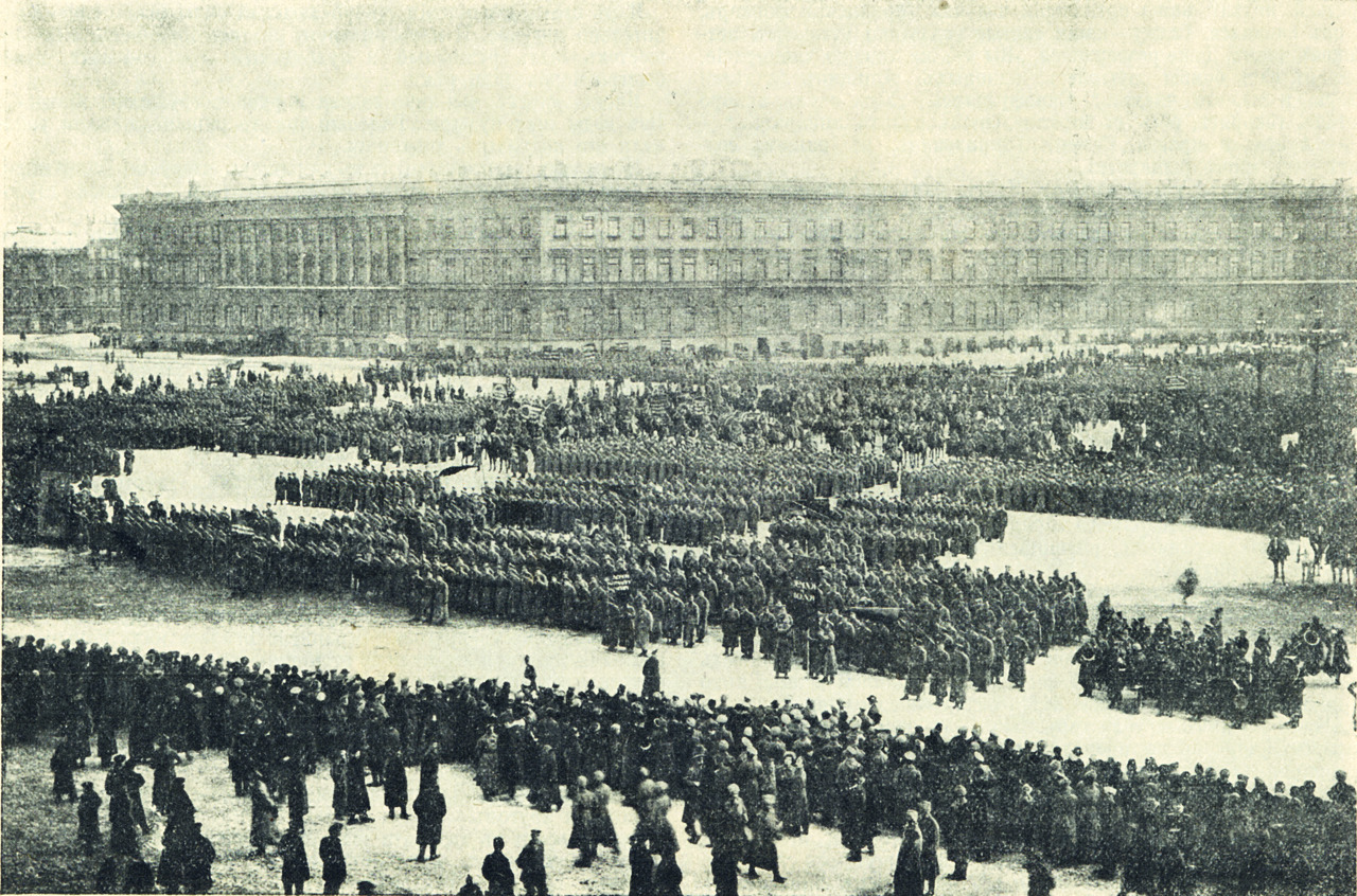Первые дни свободы в Петрограде. Войска на площади Зимнего дворца у здания Главного штаба. 1917 год (Фото предоставлено М. Золотаревым)