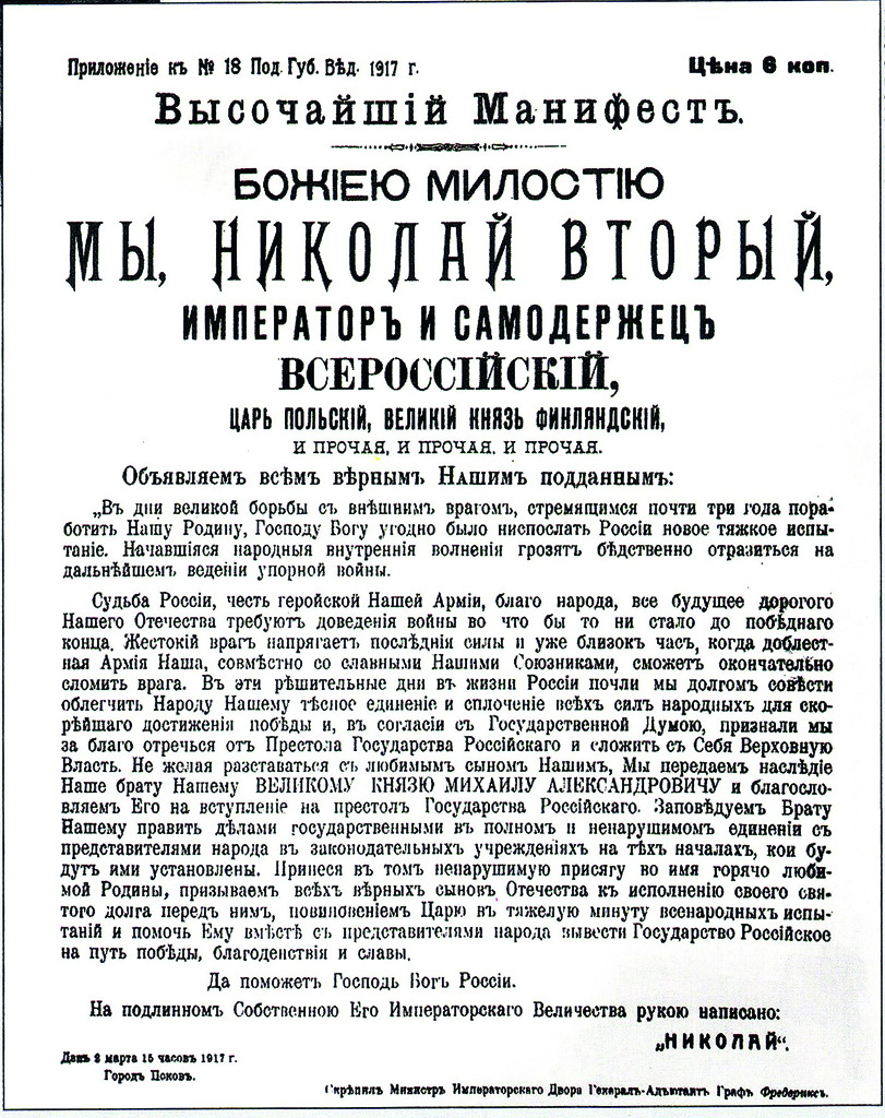 Император подписал документ, в котором говорилось о сложении им верховной власти, в Пскове в ночь со 2 (15) на 3 (16) марта 1917 года, в промежуток времени между 23 час. 32 мин. и 0 час. 28 мин. Однако в самом документе значится другое: «2-го марта 15 час.». Это время, когда Николаем были собственноручно написаны телеграммы председателю Государственной Думы Михаилу Родзянко и начальнику штаба Верховного главнокомандующего Михаилу Алексееву о его готовности отречься от престола в пользу сына. Император, поставив этот час на документе об отречении, стремился показать, что решение им было принято не под давлением, а самостоятельно – во имя сохранения России.