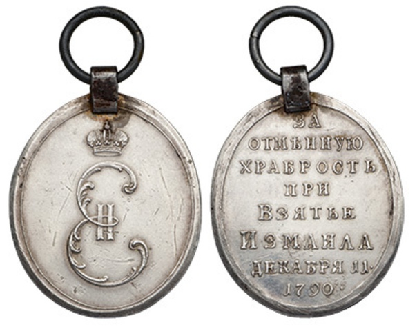 Она была отчеканена в форме овала; на аверсе вензель под короной, но почему-то без веточек (не намёк ли тут, что лавры Фокшан и Рымника крепко хлестнули по чьему-то самолюбию?); на реверсе — восьмистрочная надпись: «ЗА — ОТМЕННУЮ — ХРАБРОСТЬ — ПРИ — ВЗЯТЬЕ — ИЗМАИЛА — ДЕКАБРЯ 11 — 1790».